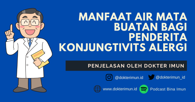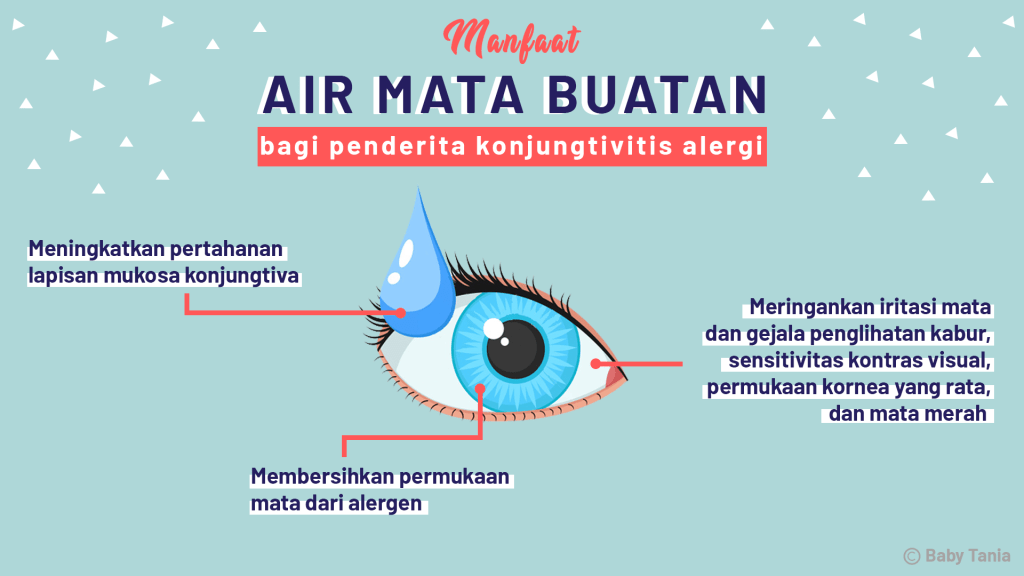 Air mata buatan memberikan fungsi penghalang dan membantu meningkatkan pertahanan lini pertama secara mekanik pada lapisan mukosa konjungtiva. Air mata buatan ini membantu mengencerkan berbagai alergen dan mediator inflamasi yang mungkin ada di permukaan mata, dan membantu membersihkan permukaan mata dari alergen-alergen ini. Akibatnya, kontak antara alergen dengan permukaan mata dapat diminimalisasi. Beberapa air mata buatan yang mengandung kombinasi antara cairan saline dan cairan pembasah meringankan keluhan dengan cara memberi lubrikasi pada permukaan mata.4,5,7