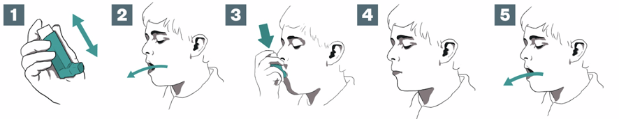 Dapat dilihat pada kemasan inhalernya untuk instruksi detailnya harus berapa kali diulang. Setelah itu, kocok canister selama 5 detik dan pegang MDI menggunakan jari telunjuk diatas canister dan jempol di bagian bawah inhaler. Napas yang normal lewat mulut dan pasang mouthpiece nya di antara gigi.