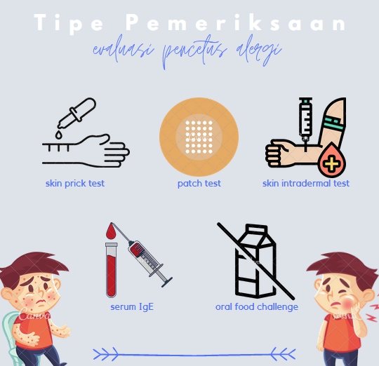 Evaluasi pencetus alergi membutuhkan pendekatan klinis yang meliputi riwayat perjalanan penyakit dan pemeriksaan fisik yang dapat mengarahkan kebutuhan untuk melakukan pilihan dari berbagai jenis pemeriksaan alergi yang membantu untuk menentukan diagnosa dan tatalaksana yang tepat.3