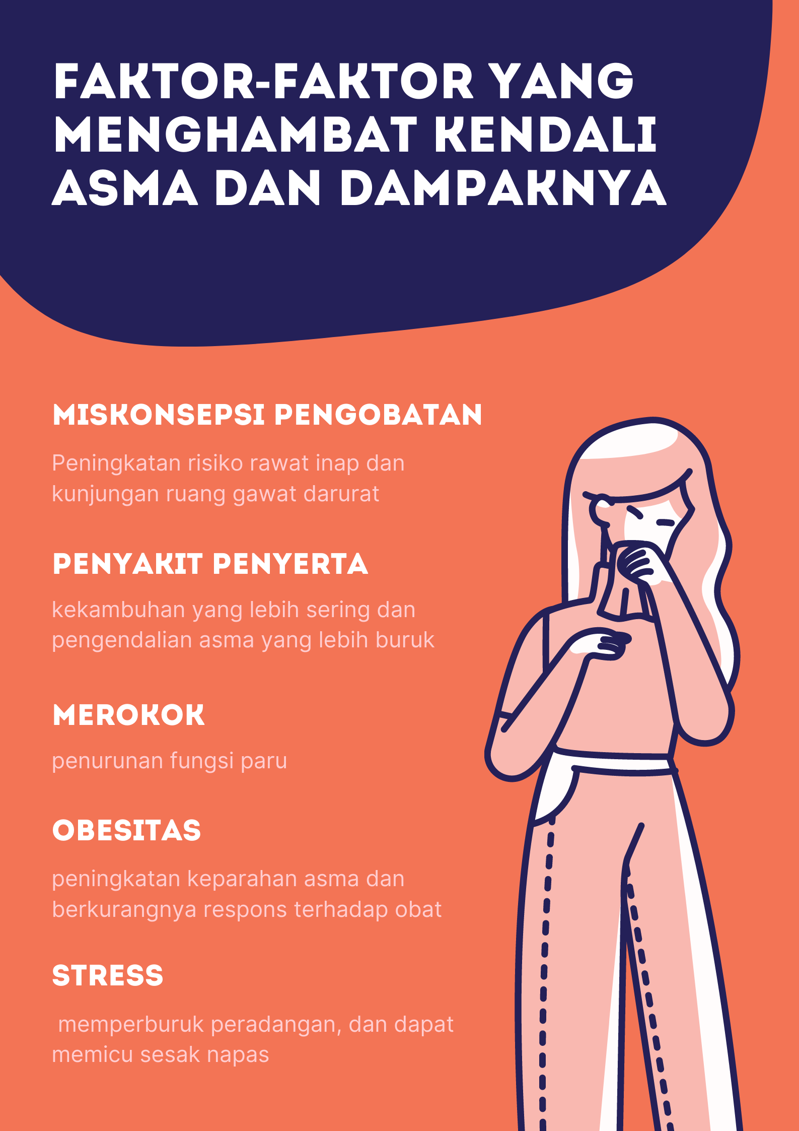 Asma adalah penyakit peradangan kronik saluran napas yang ditandai dengan adanya mengi, batuk dan rasa sesak di dada yang berulang dan timbul terutama pada malam atau menjelang pagi akibat penyumbatan saluran pernapasan. Penyakit ini masih menjadi masalah kesehatan masyarakat di hampir semua negara di dunia, diderita oleh anak-anak sampai dewasa dengan derajat penyakit dari ringan sampai berat, bahkan beberapa kasus dapat menyebabkan kematian. Saat ini, tujuan utama pengobatan asma adalah mengendalikan penyakit dan meminimalkan jumlah episode kekambuhan. Asma dapat dikendalikan secara efektif dengan menghindari faktor pemicu dan dengan mematuhi rejimen pengobatan sesuai anjuran dokter. Namun di negara maju sekalipun, sebanyak 40-70% penderita memiliki asma yang tidak terkontrol secara memadai.1 Ada beberapa faktor yang dapat memengaruhi pengendalian asma.