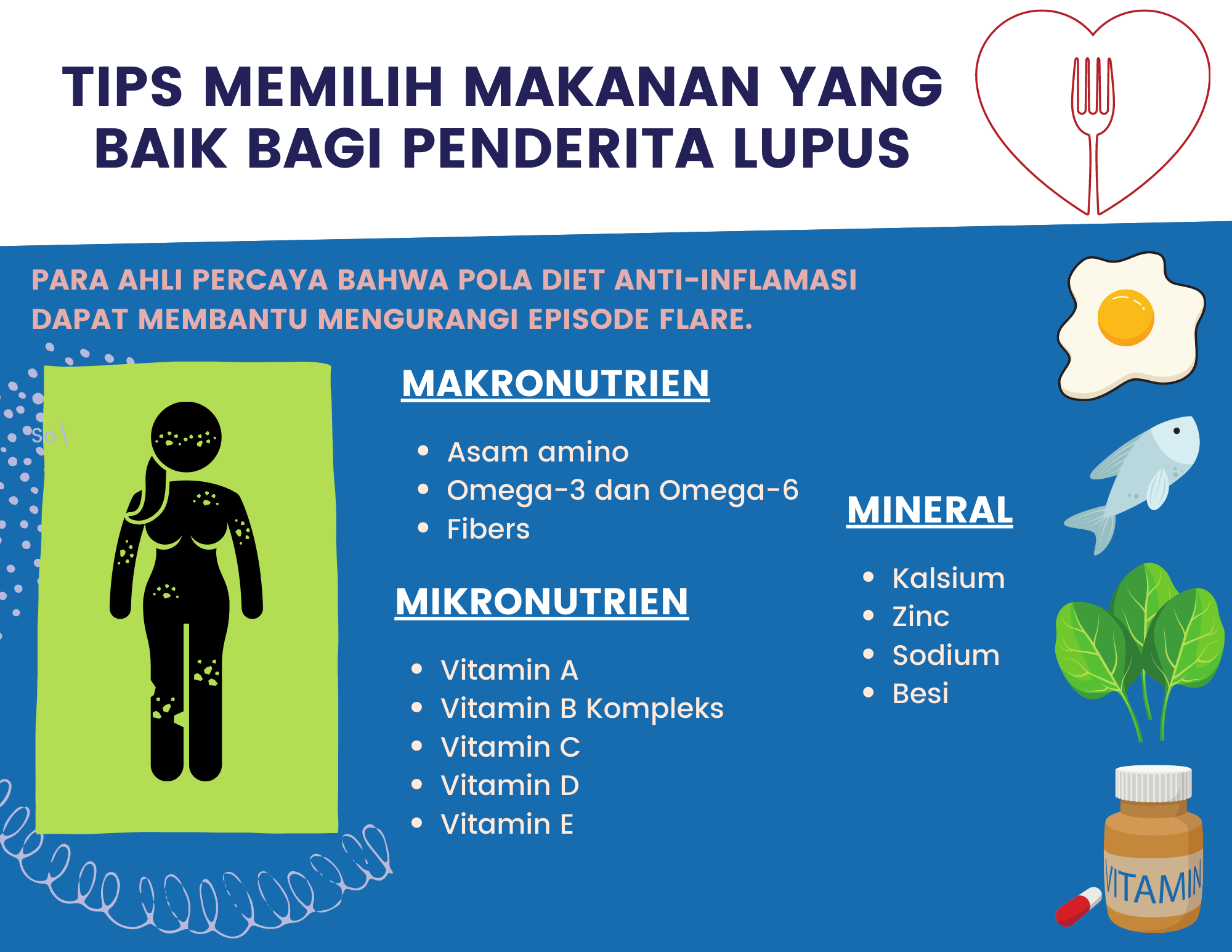 Sumber micronutrient yang baik dikonsumsikan penderita lupus adalah vitamin A, B kompleks, C, D dan E. Sumber vitamin A alami yang utama adalah wortel, labu, bayam, ubi jalar dan hati. Vitamin B kompleks ditemukan dapat memperingan gejala klinis pada SLE. Suplai makanan terbaik untuk vitamin B kompleks adalah daging merah dan sereal. Sumber lainnya dari vitamin B kompleks adalah ayam, salmon, sarden, kacang – kacangan, telur, pisang dan alpukat. Vitamin C diketahui sebagai antioksidan penting yang dapat mencegah stress oksidatif sehingga mengurangi peradangan. Vitamin C harus ditambahkan pada pasien SLE dengan dosis maksimum 1g/hari, atau juga dapat dikombinasi dengan vitamin E karena aksi mereka yang sinergis. Sumber vitamin C yang sangat baik adalah jus jeruk, jeruk keprok, papaya dan brokoli. Vitamin D adalah hormon steroid yang berperan penting dalam metabolisme mineral dan keseimbangan sistem kekebalan, Defisiensi vitamin D telah dikaitkan dengan peningkatan kerentanan terhadap SLE. Makanan dengan kandungan vitamin D yang baik adalah telur dan ikan berlemak seperti salmon, makerel dan sardine. Vitamin E, jika dikombinasikan dengan asam lemak omega-3 dapat menyebabkan berkurangnya inflamasi dalam tubuh. Terdapat juga mineral – mineral yang dapat bermanfaat untuk penderita SLE. Mineral – mineral ini adalah kalsium, zinc, sodium dan besi.