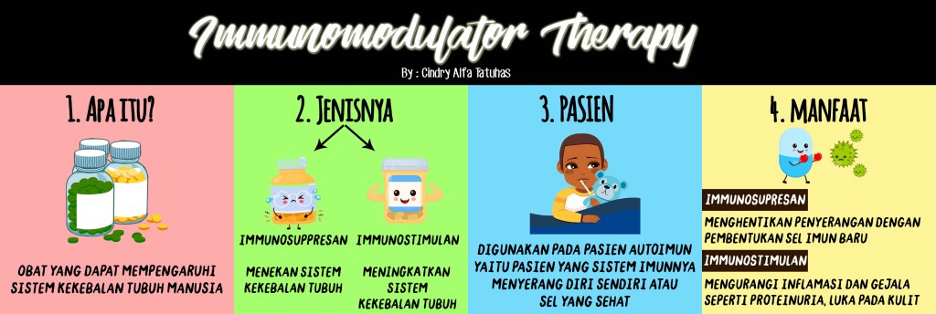 Penyakit autoimun adalah suatu kondisi di mana sistem imun seseorang menyerang sel sehat didalam tubuhnya sendiri. Sistem kekebalan berfungsi sebagai sistem pertahanan untuk melawan dan melindungi tubuh dari “benda asing”. Pada penyakit autoimun, sistem kekebalan tubuh mengakibatkan kerusakan pada jaringan tubuh sendiri.1 Pada penderita autoimun, obat – obatan imunomodulator digunakan untuk mengurangi gejala yang dialami sekaligus meningkatkan kualitas hidup pasien.2 Imunomodulator merupakan suatu bahan kimia atau obat yang jika dikonsumsi dapat mempengaruhi sistem kekebalan tubuh manusia. 3 Berdasarkan cara kerjanya dalam mempengaruhi sistem kekebalan tubuh seseorang, obat imunomodulator terbagi menjadi dua tipe, yaitu imunosupresan dan imunostimulan.