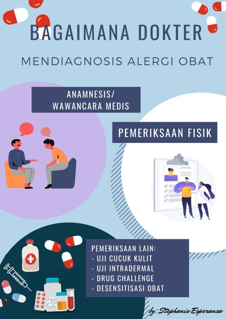 Diagnosis alergi obat bisa dilakukan dengan menanyakan kepada pasien mengenai riwayat penyakit, riwayat konsumsi obat, kesulitan atau gejala yang dicurigai timbul sebagai bentuk alergi obat. Diagnosis alergi obat akan lebih sulit dilakukan jika pasien mengkonsumsi lebih dari satu obat. Terdapat beberapa hal penting yang harus ditanyakan ketika melakukan wawancara pada pasien alergi obat yaitu menanyakan dan mencatat semua obat yang digunakan, riwayat pemakaian obat lama dan reaksi obat, durasi yang dibutuhkan untuk menimbulkan manifestasi alergi setelah menggunakan obat, frekuensi, dosis lama penggunan obat dan cara pemberian obat.1,3