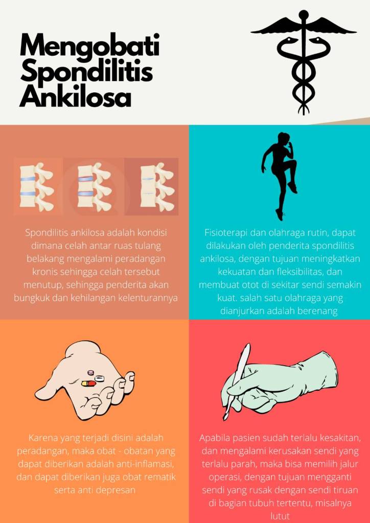 - Obat – obatan: Karena yang terjadi pada kondisi ini adalah peradangan, maka salah satu obat yang dapat digunakan untuk meredakan gejala adalah anti-inflamasi, seperti ibuprofen atau diclofenac. Selain itu, obat rematik seperti metotreksat dan sulfasalazine juga dapat digunakan. Untuk mengatasi nyeri punggung yang kronis, biasanya digunakan obat anti depresan, serta obat suntik steroid untuk digunakan ke sendi yang mengalami peradangan.3