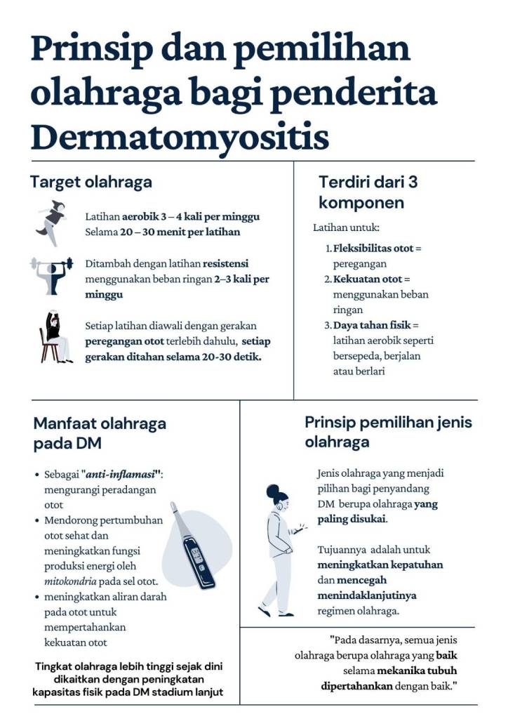 Terapi yang dapat diberikan pada penyandang DM selain obat supresi imun merupakan terapi non-obat. Terapi non-obat yang dapat dilakukan termasuk menghindari matahari dan menggunakan tabir surya. Selain itu, olahraga dan fisioterapi berperan penting dalam terapi DM. Selama beberapa tahun terakhir, publikasi baru menyajikan bukti untuk latihan resistensi intensif sebagai pengobatan anti-inflamasi yang mendorong pertumbuhan otot sehat dan meningkatkan fungsi produksi energi oleh mitokondria pada sel otot.3 Selanjutnya, pelatihan resistensi meningkatkan aliran darah pada otot sehingga membantu mempertahankan kekuatan otot.3 Peningkatan kapasitas fisik pada DM stadium lanjut dikaitkan dengan tingkat olahraga yang lebih tinggi.3,5 Publikasi baru melaporkan perubahan aktivitas inflamasi dan kesehatan otot yang dapat menjelaskan peningkatan kapasitas fisik dan kualitas hidup dengan program latihan aerobik intensif.7 Ini menyiratkan bahwa penting untuk memulai olahraga aerobik serta latihan resistensi sejak dini untuk memiliki gaya hidup aktif secara fisik dan peningkatan kapasitas fisik di kemudian hari dalam perjalanan penyakit.3