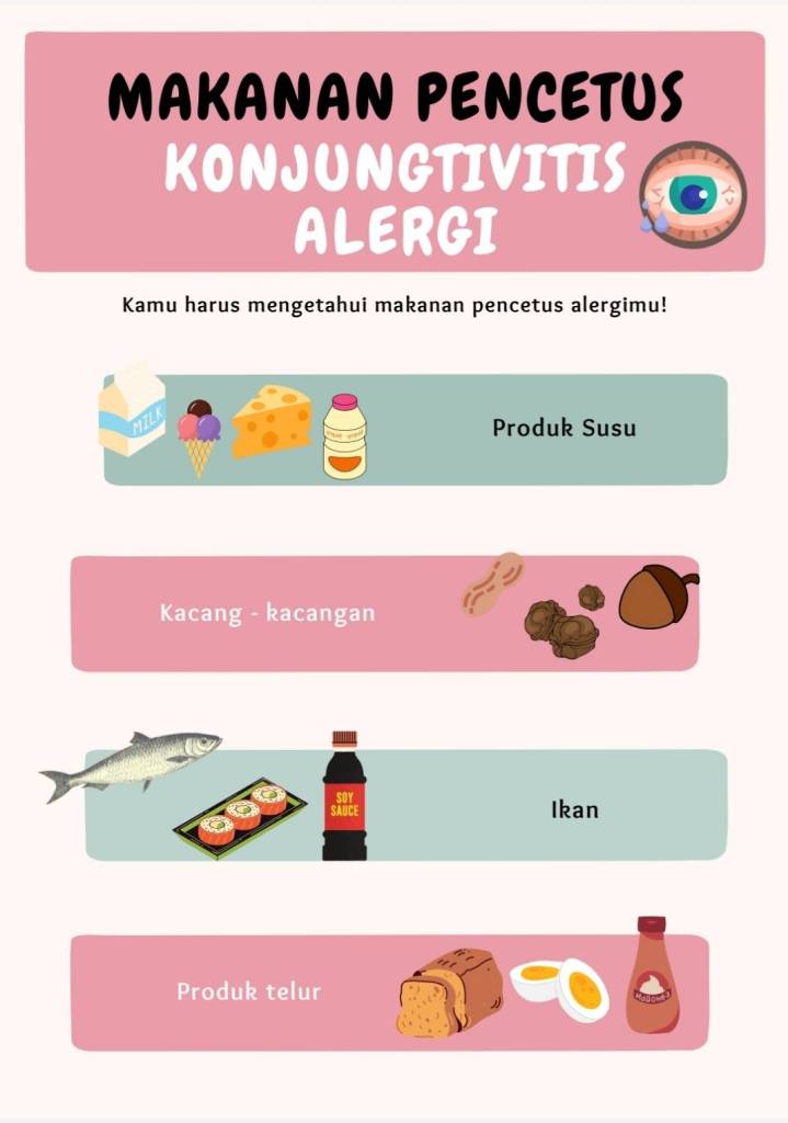 Konjungtivitis alergi merupakan satu dari beberapa gejala alergi yang dapat timbul akibat adanya reaksi abnormal dari antibodi tubuh.3 Konjungtivitis alergi merupakan salah satu penyakit yang sering ditemukan dan dikeluhkan oleh pasien–pasien yang datang ke poli mata. Tanda dan gejala khas dari konjungitivitis alergi adalah adanya rasa gatal, mata merah, mukus dari mata, terasa panas dan kelopak mata membengkak. Angka kejadian konjungtivitis alergi meningkat di negara maju dengan bermacam – macam faktor risiko.1 Reaksi alergi terjadi apabila makanan yang memicu respon imun abnormal melalui reaksi tipe I dimana antibodi IgE akan terlibat. Gejala klinis alergi dapat terjadi dalam waktu singkat (biasanya dalam 2 jam). Antibodi IgE memainkan peran utama dalam alergi.2 Reaksi makanan yang dimediasi IgE terjadi ketika alergen makanan mengikat IgE spesifik alergen yang ada pada sel mast dan basofil, yang mengarah pada pelepasan beberapa mediator seperti histamin.3