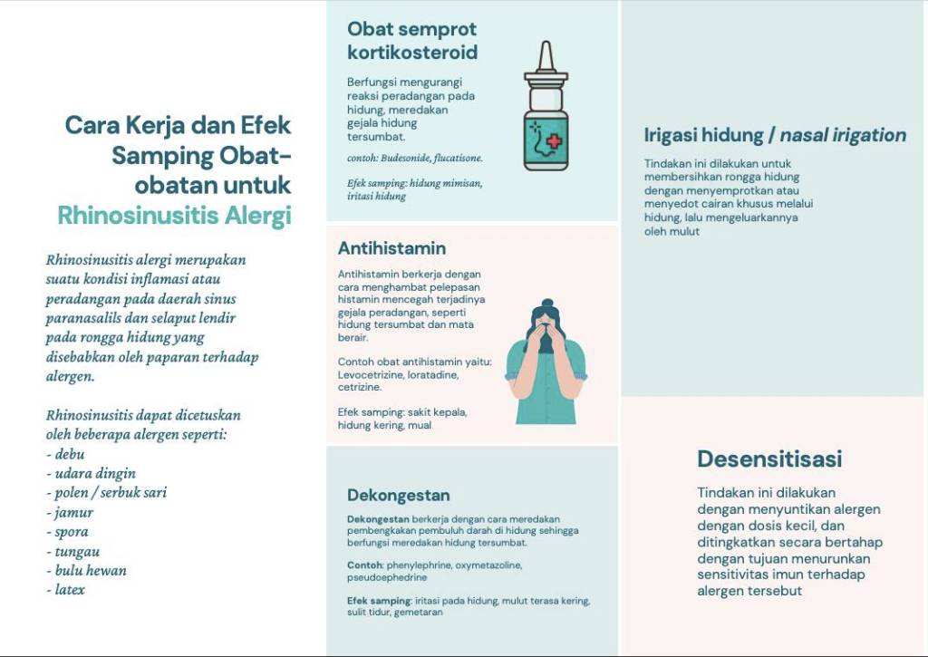 Antihistamin merupakan golongan obat dengan kerja cepat. Pada penderita rhinosinusitis alergi, sistem imun akan bereaksi secara berlebihan sehingga terjadi pelepasan histamin dari sel darah putih, yang akan memicu terjadinya peradangan saat terjadi paparan terhadap zat alergen. Antihistamin berkerja dengan cara menghambat pelepasan histamin sehingga tidak menimbulkan gejala peradangan, seperti hidung tersumbat dan mata berair.4 Antihistamin tersedia dalam bentuk semprotan hidung atau obat minum. Contoh obatnya yaitu levocetrizine, loratadine, dan cetirizine. Efek samping antihistamin generasi pertama yaitu sakit kepala, hidung kering dan mual.