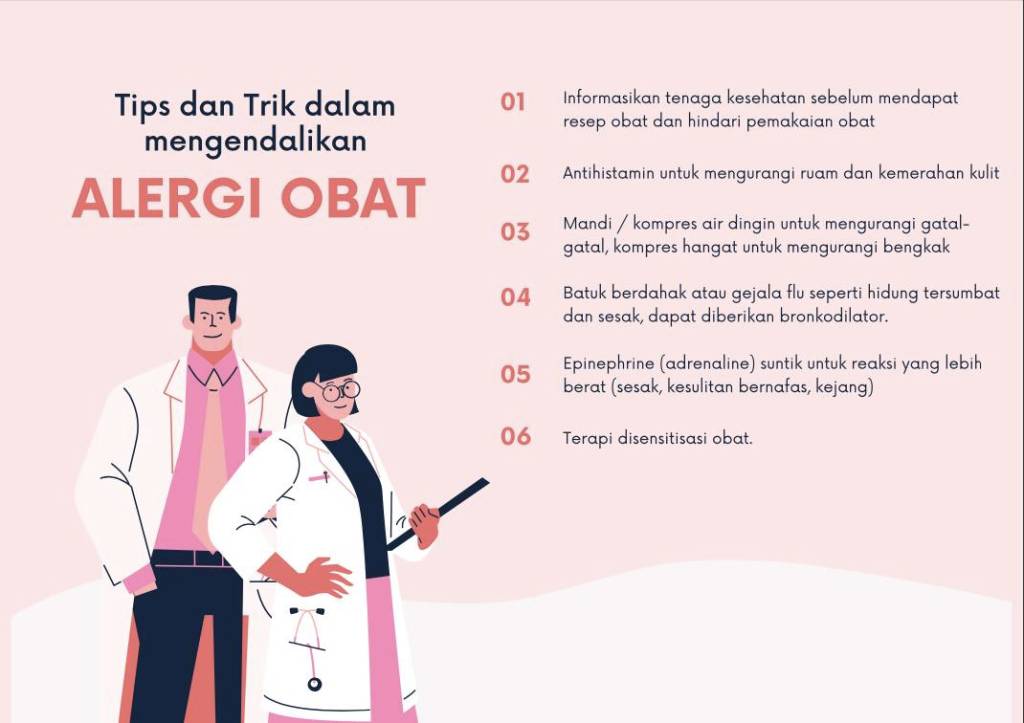 Pasien yang memiliki alergi obat sebaiknya menghindari pemakaian obat tersebut dan menginformasikan tenaga kesehatan sebelum mendapatkan resep obat. Beberapa cara untuk mengobati alergi obat adalah untuk mengendalikan gejala klinis pasien4 :