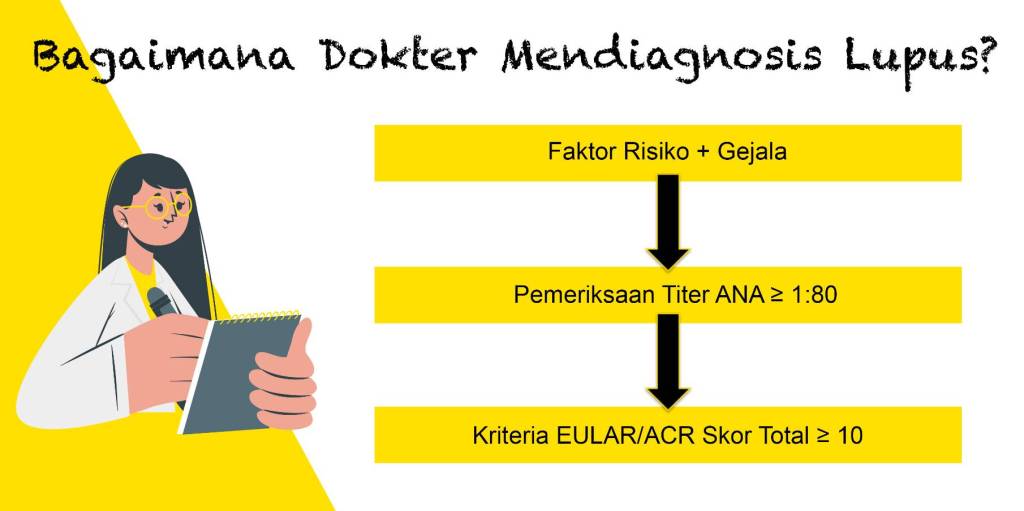 Jika pasien telah dicurigai memiliki lupus, maka dapat dilakukan pemeriksaan darah berupa titer antinuclear antibody (ANA) yang pada umumnya akan terlihat peningkatan. ANA yang meningkat akan menandakan kemungkinan adanya kondisi autoimun sehingga perlu diselidiki lebih lanjut akan kemungkinan dari lupus tersebut. Pada umumnya dapat dicari berdasarkan 2 kelompok secara garis besar yang masing-masing dapat dibagi menjadi kelompok yang lebih kecil. Kedua kelompok ini adalah dari segi klinis dan dari segi imunologi, dimana dari segi klinis akan dicari apakah orang tersebut sedang sakit, memiliki gangguan darah, gangguan psikiatri, gangguan ginjal, dan lain-lain. Sedangkan dari segi imunologi akan dicari melalui pemeriksaan penunjang seperti pemeriksaan penanda antibodi fosfolipid, pemeriksaan komponen protein lengkap dan pemeriksaan antibodi spesifik terhadap SLE. Lalu, seorang dokter akan dapat mendiagnosis apakah pasien tersebut menderita lupus dari hasil yang didapatkannya.3