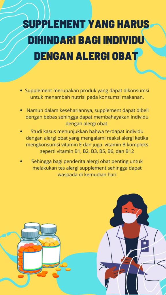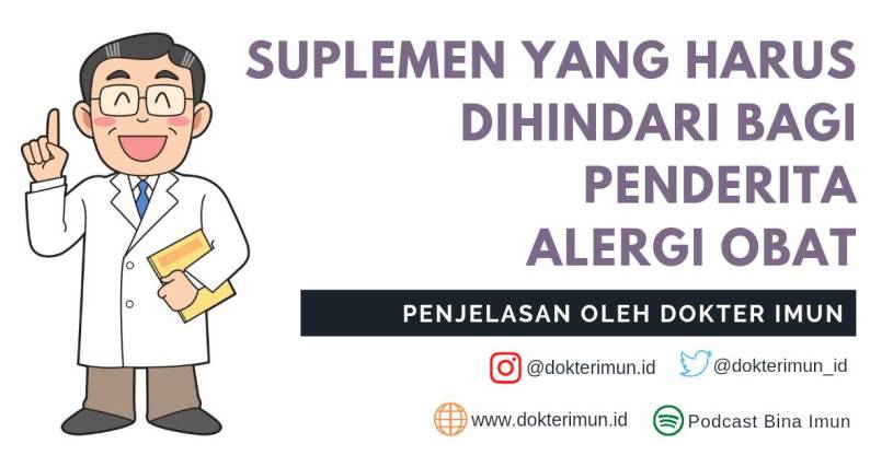 Suplemen bagi penderita alergi obat disarankan untuk menjalani pengawasan. Hal ini karena suplemen dapat dijual bebas tanpa perlu menggunakan resep dari dokter, sehingga dapat dikonsumsi tanpa ada pengawasan dari pihak profesional.3