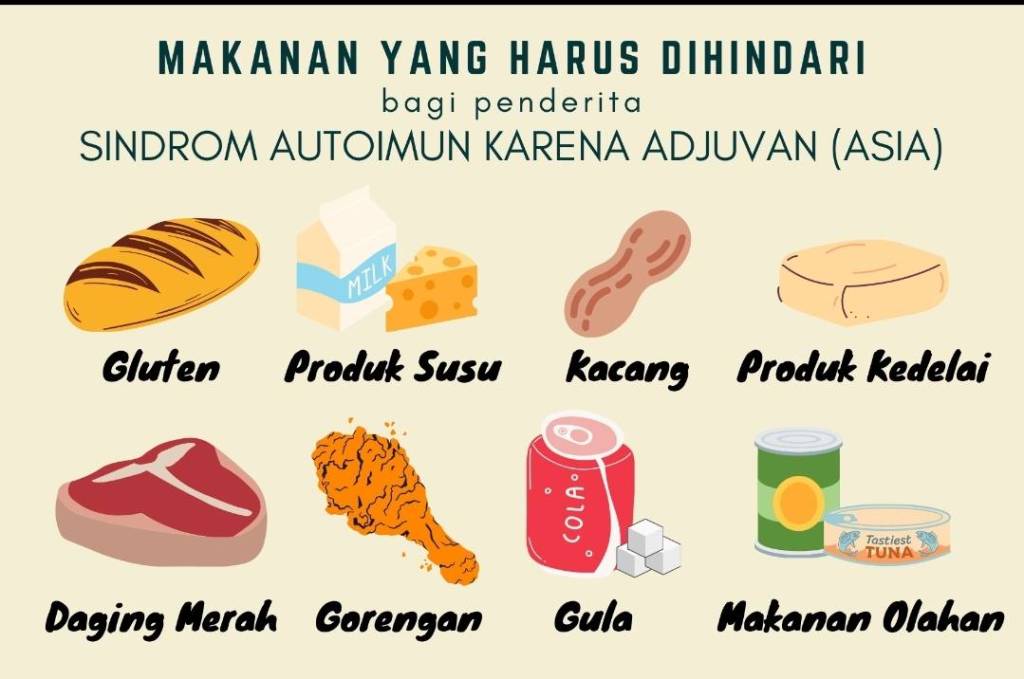 Salah satu cara untuk mengurangi gejala penyakit ASIA adalah dengan menerapkan pola makan yang baik. Nutrisi yang berkualitas dengan jumlah yang sesuai diperlukan oleh sistem imun untuk berfungsi secara optimal. Penyakit autoimun seperti ASIA terjadi karena respons imun tubuh yang menyerang sel tubuh sendiri. Penyebab respons autoimun dapat dibagi menjadi faktor genetik dan faktor lingkungan. Genetik merupakan faktor yang tidak dapat diubahkan. Namun, faktor lingkungan seperti pola makan dapat diubah dan disesuaikan untuk meminimalisir gejala penyakit autoimun.3