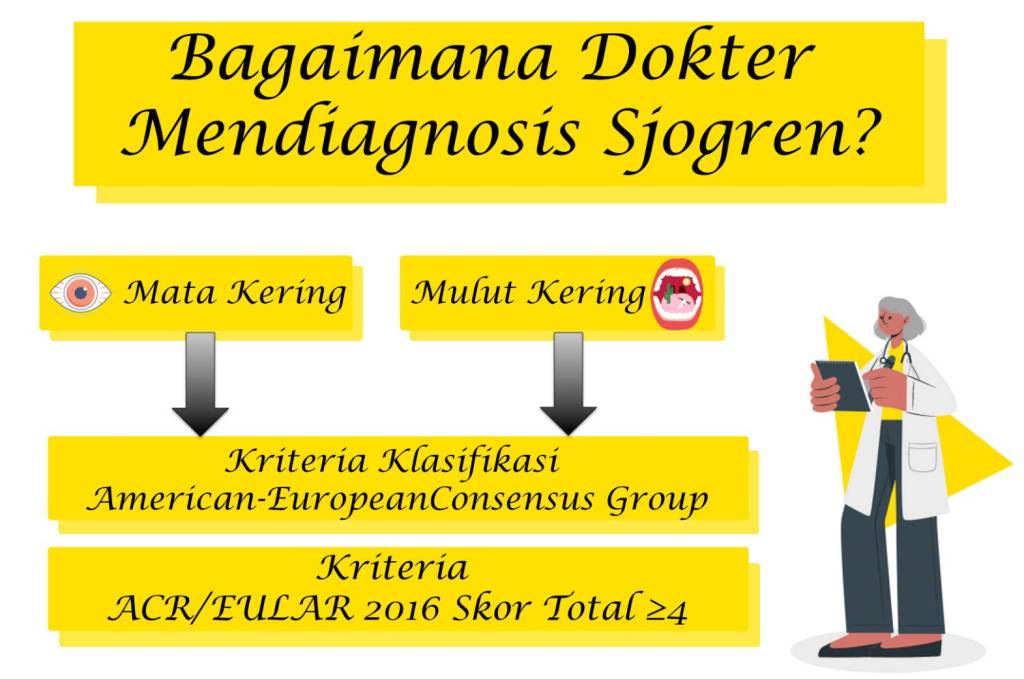Sjogren dapat dibagi menjadi dua kategori yaitu sjogren primer, di mana sjogren terjadi sendiri dan ditemani dengan kondisi lainnya dan sjogren sekunder, di mana sjogren muncul bersama kondisi autoimun lainnya seperti lupus dan artritis reumatik. Sehingga gejala yang dapat muncul pada sjogren sangat beragam, namun gejala yang paling sering ditemukan berupa mata kering, mulut yang kering, nyeri sendi dan kelelahan.1,2 Lalu jika gejala yang ditimbulkan beragam, bagaimana caranya seorang dokter dapat mendiagnosis seseorang dengan sindrom sjogren?