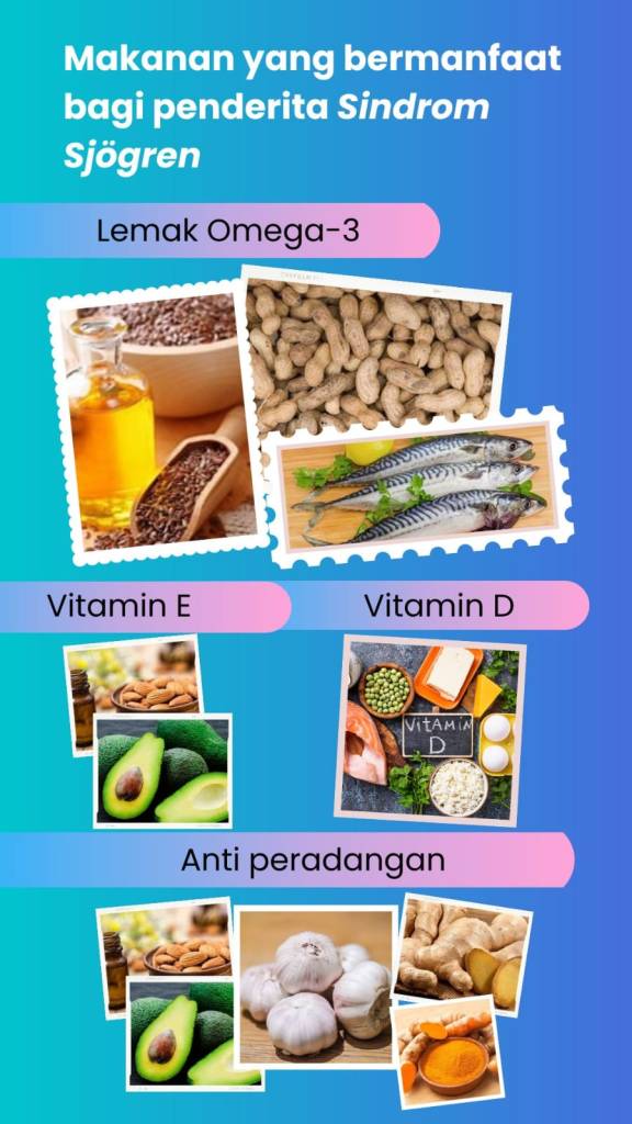 Makanan kaya akan antioksidan seperti lemak omega-3 dan vitamin E terbukti memiliki efek yang dapat meringankan gejala mata dan mulut yang kering. Lemak omega-3 dapat ditemukan pada daging ikan seperti tuna, salmon, makerel. Makanan kacang-kacangan juga dapat sebagai pilihan seperti kacang tanah, kacang kenari. Sedangkan makanan seperti biji bunga matahari, almon, mentega almon, alpukat, bayam, brokoli, minyak zaitun, dan udang merupakan makanan yang kaya akan vitamin E. Selain lemak omega 3 dan vitamin E, makanan kaya vitamin D juga penting bagi penderita SS.2,3