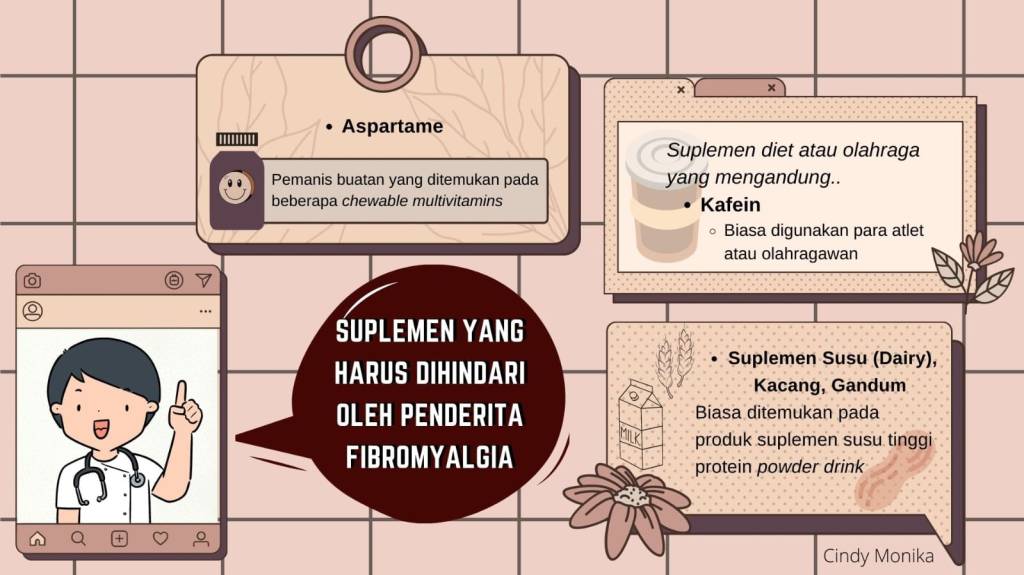 Pada penjelasan sebelumnya pemicu atau factor yang memperberat gejala fibromialgia adalah terjadinya peradangan atau inflamasi.2,3 Kondisi tersebut dapat berasal dari stress, trauma, riwayat penyakit inflamatori hingga asupan sehari-hari. Mengapa demikian? Terdapat beberapa makanan yang dapat menimbulkan peradangan atau gejala flare pada penderita fibromialgia.3,5 Contohnya beragam roti, kue, pastry lainnya terdiri atas karbohidrat refinasi (Refined Carbs). Karbohidrat tersebut diproses lebih cepat oleh sistem pencernaan hingga membuat glukosa naik secara spontan dan menimbulkan gejala nyeri terutama keluhan saluran pencernaan.6,7 Jenis minyak sayuran (vegetable oils) yang biasa dijumpai pada suplemen kolesterol atau makanan goreng-gorengan berupa corn oil, safflower oil hingga kacang-kacangan pada produk minuman tinggi protein dari kombinasi kacang kedelai, polong, dan biji gandum dapat memicu gejala fibromialgia. Beberapa suplemen susu berbentuk bubuk mengandung bahan tersebut.3,7 Selain itu, konsumsi alkohol dan kafein hingga suplemen para atlet atau yang sedang menjalani program diet dalam menurunkan berat badan dapat mengandung kafein yang membuat proses peradangan kembali. Beberapa vitamin terutama vitamin anak yang chewable seringkali dibuat manis dan mengandung pemanis buatan yaitu aspartame. Aspartame dapat memanggil sel-sel inflamatorik dan menyerang sistem imun.3,6,7 Selain makanan, mengatur pola stress dari mendapatkan tidur yang cukup, berolahraga teratur dapat menghindari kekambuhan gejala fibromialgia.2,8 Oleh karena itu, salah satu kunci terapi atau pengobatan penderita fibromialgia saat ini dengan mengatur gaya hidup yang sehat.