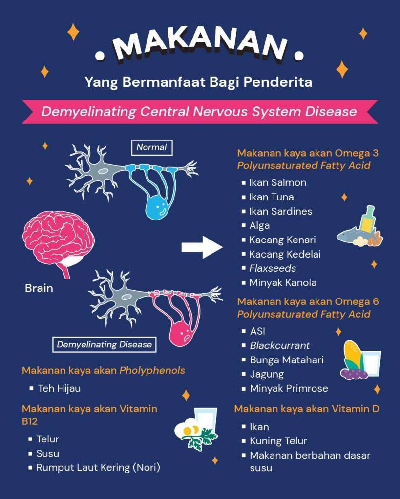 Vitamin D bisa didapatkan dari makanan dan dari dalam tubuh dan dibantu oleh sinar matahari.3,4 Selain berasal dari matahari, vitamin D dapat ditemukan dari berbagai makanan seperti ikan, kuning telur dan berbagai makanan berbahan dasar susu lainnya, rekomendasi suplementasi vitamin D untuk anak-anak dan remaja (umur 1-8 tahun) adalah 600-1000 IU perhari (sesuai dengan masa tubuh)11 Vitamin B12 atau cyanocobalamin juga memiliki pengaruh positif terhadap proses remyelinasi, yaitu pembentukan ulang selubung pada sel saraf, dimana B12 dapat meningkatkan kematangan sel sehingga dapat meningkatkan proses remyelinasi. Vitamin B12 dapat ditemukan pada susu, telur, daging dan rumput laut.5 Polyphenol yang berasal dari makanan dapat menurunkan proses demyelinasi dengan mengatur respon imun. Flavan-3-ol yang terkandung pada teh hijau juga membantu menurunkan respon autoimun.6