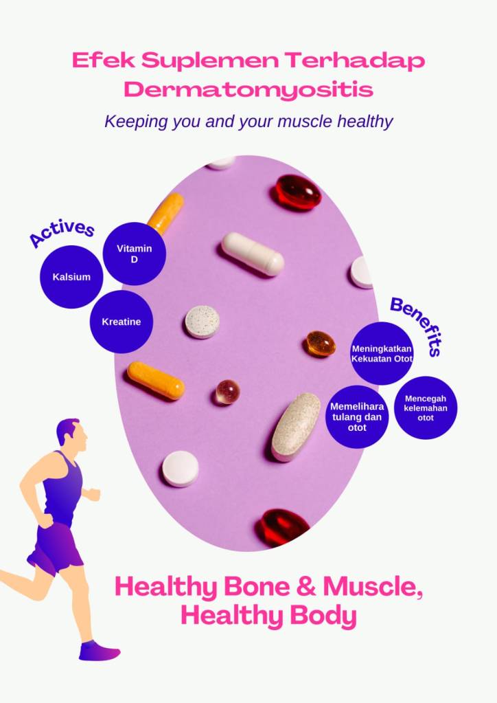 Menurut beberapa hasil penelitian menunjukan bahwa konsumsi suplemen kreatin, kalsium dan vitamin D memiliki efek postif tidak hanya kepada penderita dermatomyositis tetapi juga berdampak baik kepada individu dengan gangguan fungsi otot. Selain itu, efek samping yang dapat timbul dari komsumsi suplemen tersebut sangat minimal dan aman untuk dilanjutkan dalam jangka waktu panjang. Dari sisi ekonomi, harga dari suplemen tersebut beragam tetapi tergolong tidak terlalu mahal dan juga ketersediaan dari suplemen tersebut sangat banyak dan mudah diakses oleh individu pada apotik atau fasilitas kesehatan primer.