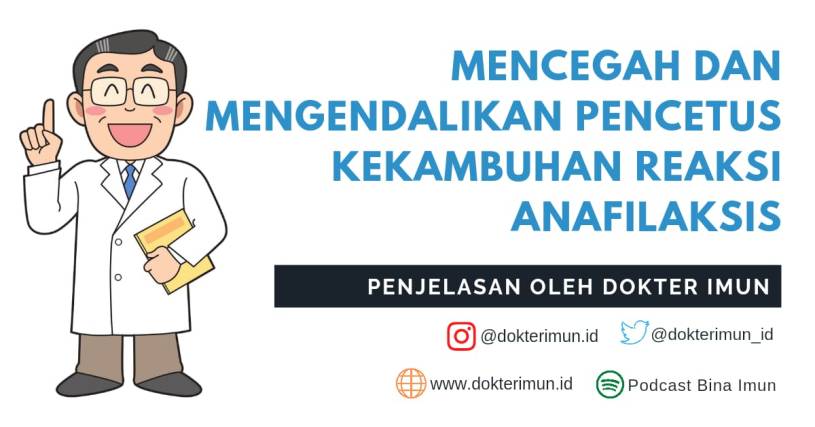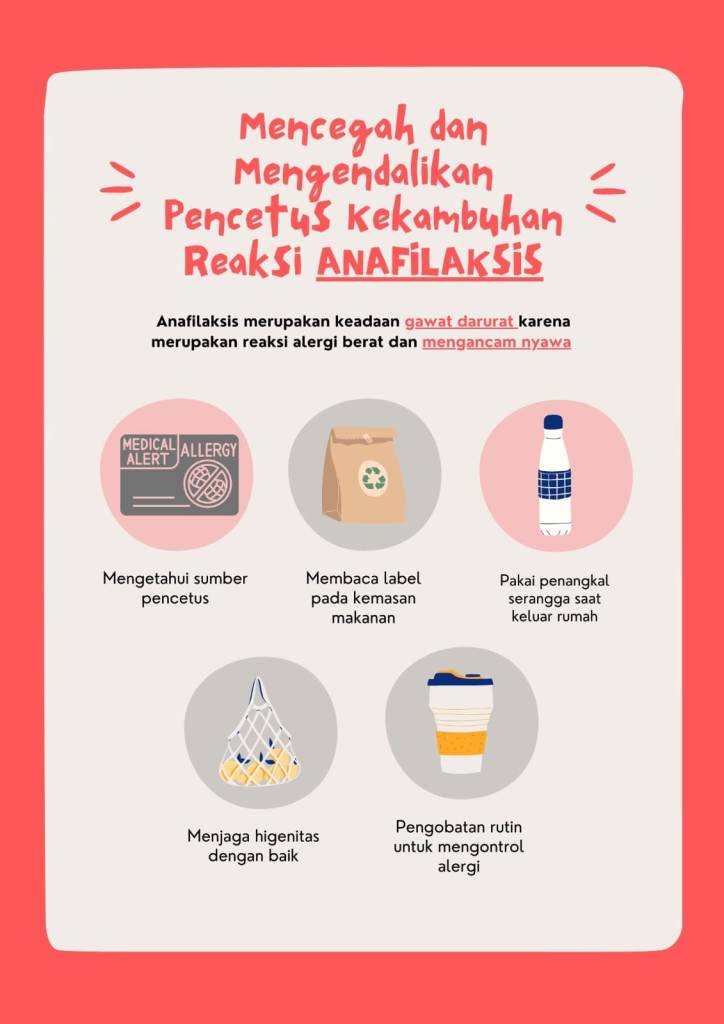 Setelah mengetahui sumber pencetus tersebut perlu dilakukan pengawasan ketat untuk menghindari pencetus tersebut. Pengawasan ketat berupa menghindari, mencegah dan mengontrol paparan dengan pencetus. Membiasakan diri untuk membaca label keterangan pada kemasan makanan, terutama jika memiliki riwayat alergi makanan tertentu. Menggunakan penangkal serangga untuk mencegah terjadi kontak terutama Ketika sedang berada di luar ruangan. Menggunakan alas kaki dengan baik dan benar, menjaga higenitas dan melakukan pengobatan rutin ke dokter dengan memberitahukan menganai riwayat Kesehatan untuk mengontrol dan mencegah terjadinya kekambuhan. Hal ini akan membantu mengendalikan terjadinya kekambuhan anafilaksis, sehingga menurunkan resiko serangan berat. 1,5