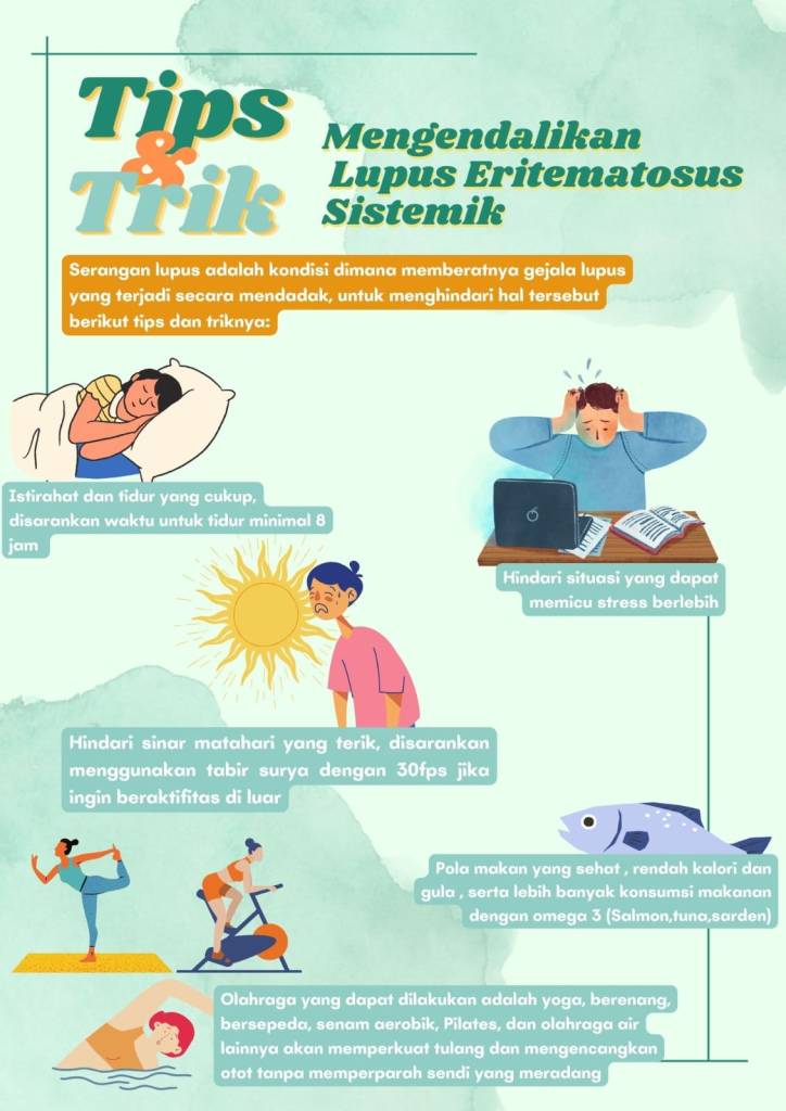 - Istirahat yang cukup tentunya menjadi salah satu cara yang paling ampuh untuk mencegah terjadinya serangan lupus. Terlalu lelah karena pekerjaan ataupun aktivitas sehari-hari dapat menjadi salah satu pemicu lupus untuk aktif. Kurangnya tidur dapat memicu aktifnya faktor-faktor inflamasi dalam tubuh, sehingga peradangan dapat lebih mungkin terjadi. Peradangan yang aktif dapat memicu munculnya gejala-gejala lupus, seperti ruam, demam, nyeri sendi, nyeri otot, dan masih banyak lagi. Maka dari itu disarankan waktu ideal untuk mengendalikan lupus adalah 8 jam, agar mendapatkan energi yang cukup untuk menajalani aktivitas sehari-hari.4
